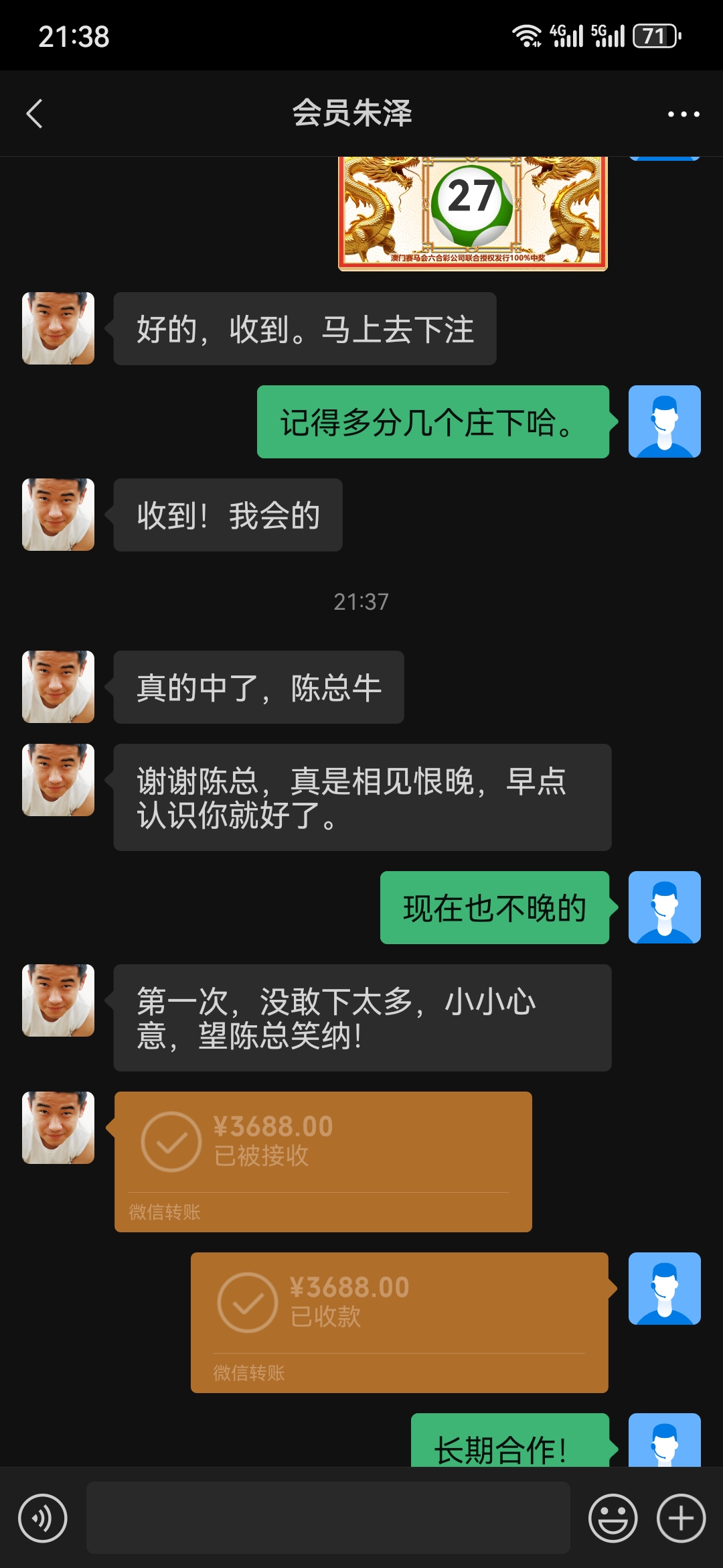 陈总真的是太谢谢您啦!最近的资料让我赢了不少!这么好的资料想不发财都难,合作有7期啦,我赚了一百来万了哦,我还给彭总转了5万块红包,祝身体健康,发大财! |