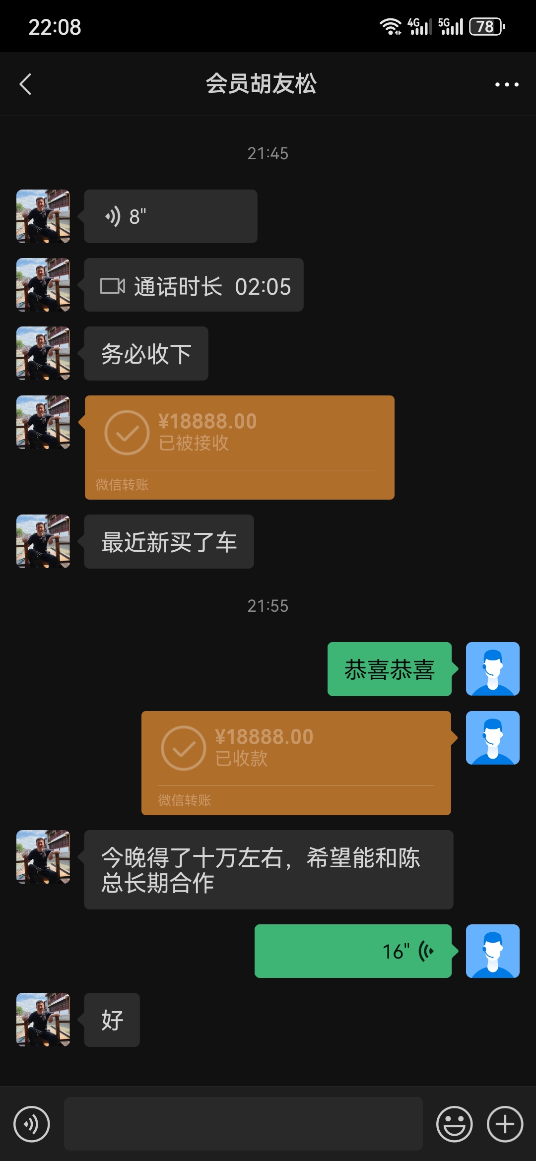 陈总不好意思,昨天有点急事回老家一趟,今天才回来,上期中奖的钱已经拿到手了,16888块钱的红包我转过去是给你喝茶的,没有你我也是穷光蛋一个,这点小钱不算什么。以前那些所谓的朋友在我落难的时候五百块钱都不愿意借给我,现在想想心里真的是凉透了, 陈总你说的很对,真正希望你赚到钱、希望你生活过的好的人只有家人,所谓的朋友情谊都是假的,现在我只想赚钱让家人过上好的生活,谢谢陈总,后期中奖还会给你更多的红包的,谢谢。 |